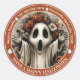 A hauntingly elegant Halloween envelope seal featuring a ghostly figure nestled among vintage florals and antique textures. This circular design blends spooky charm with romantic gothic flair, perfect for adding a touch of mystery to seasonal mailings. With customisable text and layout, it's ideal for personalising Halloween invitations, party favours, or festive correspondence.