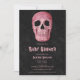 This gothic dusty pink skull head baby shower invitation design features a vintage spooky Halloween goth style typography on a black texture old fashioned antique style grunge background. Image copyright Marg Seregelyi Photography.