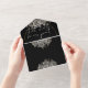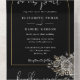 All in one gothic wedding invitation featuring black and gold roses florals falling across a gold arch enclosing elegant typography. The invitation includes a perforated RSVP card that features your wedding website QR code and details. Designed by Thisisnotme©