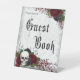 Guestbook pedestal sign with skull and red and black roses, for gothic wedding or Halloween party. Pre-made text with fancy gothic font. Look for other matching items in the collection "Gothic Wedding Skulls and Roses G19"