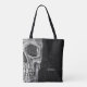 Gothic macabre black and white cool grunge texture print half skull head tote bag. Spooky, creepy, evil, sinister. Custom Goth typography on both sides to suit your needs. Trendy, unique, modern, scary Halloween inspired design. Image copyright Marg Seregelyi Photography.