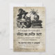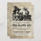 Gothic Halloween party invitation in vintage style with a beautiful witch with her wolf, a spider and a skull on old books to give you a spooky atmosphere. Old paper texture and old style text.