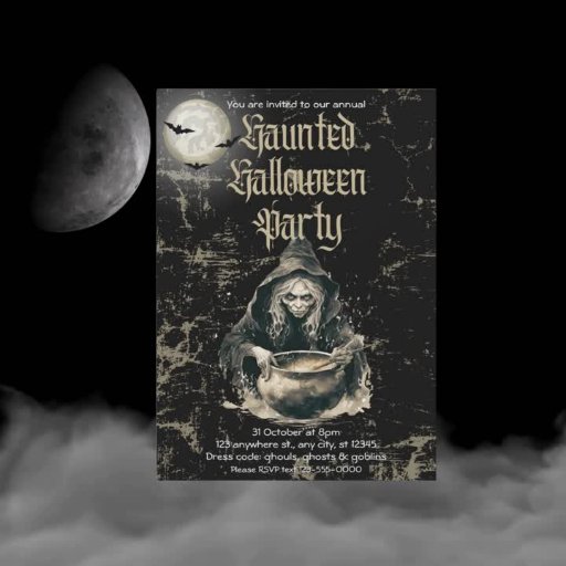 Gothic Haunted House Witch Halloween Costume Party Invitation. This invitation card features a dark, Gothic design with a misty black background. Ornate rustic golden accents frame the card, while the event title, "Haunted Halloween Party," is displayed in a eerie gold Gothic script. Subtle image of a spooky witch mixing her magical potion and a full moon enhance the eerie atmosphere, inviting guests into a night of spooky encounters.