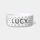 This subtle gothic and minimalist dog feeding bowl for food or water features a pattern with mini bats on a silver and white watercolor background. Add your pet’s name for a one-of-a-kind ceramic dish that’s both microwave and dishwasher-safe. Whether you’re decorating for Halloween or gifting a new puppy owner, this USA-made dish brings festive charm to every mealtime. Available in two sizes: medium (25oz) and large (40oz), for kittens to adult felines. Available in two sizes, the medium one (25oz) is ideal for small to medium dogs like French Bulldogs, Shih Tzus, Boston Terriers, Pugs, and Cocker Spaniels. The large one (40oz) suits medium to large breeds like Labradors, Boxers, Bulldogs, and Golden Retrievers.