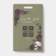 This Gothic Olive Green Skull Buy the Bride a Drink Badge blends dark romance with playful wedding fun. The front features two elegant dark floral corner designs, with a subtly laughing bride skull accent in the lower right for a bold gothic touch. Elegant olive green background. The heading “Buy the Bride a Drink” sits above a customizable QR code, with space below to add the name of your preferred payment app.