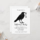 A striking black raven holding a skeleton key in it's beak, gothic Halloween party invitation. Inspired by Edgar Allan Poe. A digital art illustrated card.