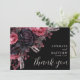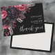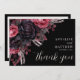 Dark Gothic Red and Black Floral Wedding Thank You Card — a romantic and moody design perfect for a gothic chic celebration. The front features a mix of black and red roses, grey foliage, deep burgundy branches, and pampas grass over an off-white background with a black border. The bride and groom’s names and wedding date appear in a mix of elegant script and classic serif fonts, with “Thank You” written boldly at the bottom. The back has a simple open space for a handwritten note, making it a heartfelt way to thank your guests. Great for fall, winter, or gothic-inspired weddings.