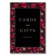 This wedding tabletop sign features a striking design with a central black square framed by a gold border, set against a vibrant background of deep red and dark floral patterns interspersed with skulls. The colour palette includes rich tones of burgundy, maroon, and black, complemented by white flowers and green leaves, creating an edgy yet romantic aesthetic. The typography within the black square is elegant, using classic serif fonts for "Cards and Gifts" and a whimsical script for "and," conveying sophistication with a touch of boldness. Perfect for expressing gratitude at your wedding, this sign blends gothic and romantic themes to make a memorable impression.
