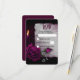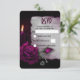 A gothic wedding RSVP card. An old greying parchment paper with hints of purple-red. A magenta rose in full bloom, a rosebud, a candle, and silver locket on a dark burgundy background creates a beautiful and mysterious gothic themed wedding RSVP card.