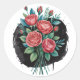A symmetrical floral design featuring four large red roses arranged in a square pattern against a dark black background. Each rose is detailed with multiple layers of petals, creating a deep crimson colour with subtle gradients. The roses are positioned at the top and bottom corners of the frame, with each rose having its own set of green leaves and stems. The leaves are detailed with visible veins and a lighter green colour. The roses cast subtle shadows on the black background, creating depth. The black background has a textured, slightly mottled appearance, giving it a rich, deep quality. The overall composition creates a balanced, decorative frame with the roses evenly distributed across the top and bottom of the image. The artwork has a vintage or classic illustration style with clean lines and detailed botanical elements.