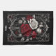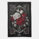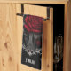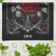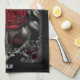 Red and white-grey roses in a vase, held in a grey, wrought-iron frame on a black background creates a lovely Goth kitchen towel.