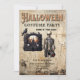 Plan a Victorian Gothic Halloween Costume Party with this eerie themed party invitation. It has a gothic spooky skeleton with a potion in hand and a ghost house with a beige-brown old paper background. Vintage typeface pairing adds authentic styling to the vintage design. Personalise the text template with your party details.