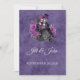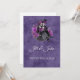 Gothic Skeleton Wedding Invitation, An elegant and macabre wedding invitation featuring a skeleton bride and groom dancing against a deep purple background with ornate gothic flourishes.