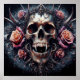 An intricately detailed depiction of a sinister skull surrounded by vibrant roses, adorned with gothic embellishments, blending dark symbolism and beauty in an artistic and surreal representation..