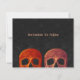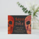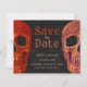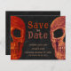 Fun, Gothic skull head Save The Date orange, black vintage style budget Halloween wedding invitation flat card. Spooky, cool Hallowedding celebration. Till Death Do Us Part script. Image copyright Marg Seregelyi Photography.
