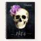 Stylish and Chic Gothic Floral Skull Personalised Notebook. Design features a white skull accented with a beautiful purple roses on a black texture background. Personalise it with your name. The title " Notes" written in modern hand lettered style script with swashes.