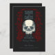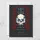 Darkly beautiful wedding save the date card with a dark moody feel. The design has a deep grey almost black background, red victorial filigree and a vintage skull. Distressed script typography in a grey blue colour adds just the right touch. Pretty, yet gothic. Add your wedding details for a special announcement that will let people know about your upcoming wedding while still showing off your unique personal style. See coordinating items in our shop, Enchanted Finch.