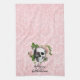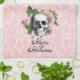 This towel features a vintage drawing of a skull with pink roses on a pink damask background. The words "Happy Halloween" is written in a spooky font.
