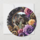 A gorgeous charming floral steampunk Save the Date card. The front is adorned with beautiful purple roses, gold and copper gears and a template to upload your favourite photo. This is made in gold, purple and black tones and has a gothic aesthetic. Add all your save the date wedding information on the back in the personalise area.