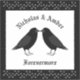 There are also white stars on a black background above and below the birds. There is custom text so you can include the names of the happy couple and a message.