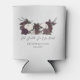 This Gothic Wedding Skulls & Roses Can Cooler features a dramatic hand-drawn illustration of two skulls adorned with dark floral roses, creating a bold gothic focal point. Beneath the artwork are editable text areas for a custom heading, bride and groom names, and wedding date for a personalized touch. The text is a very dark burgundy, almost black.