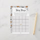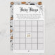 This Halloween Baby Shower game is called "Baby Bingo". The design: On the front, a BINGO game card with instructions. On the back, a hand-drawn pattern in black ink featuring Victorian baby carriages, black crows, spiderwebs, pumpkins and tiny mushrooms, all against an elegant soft grey background.