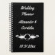 This awesome Wedding planner features a digital art image of a pair of beautiful white scorpions facing towards each other. Each scorpion is white and has eight legs, a venomous sting and a pair of pincers. The pincers are being held together to form the shape of a heart. The background is black. A beautiful gothic Wedding design. There is custom text so you can include the names of the happy couple and the Wedding date.