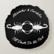 This awesome round pillow features a digital art image of a pair of beautiful white scorpions facing towards each other. Each scorpion is white and has eight legs, a venomous sting and a pair of pincers. The pincers are being held together to form the shape of a heart. The background is black. A beautiful gothic Wedding design. There is custom text so you can include the names of the happy couple and a message.