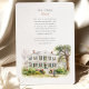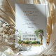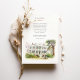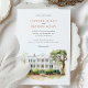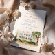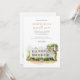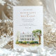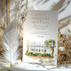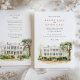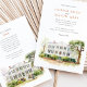 Invite your guests to a sophisticated Southern celebration with this exquisite watercolor wedding invitation, featuring the historic Governor Thomas Bennett House in Charleston, South Carolina. The artwork beautifully captures the grandeur of this classic white Southern mansion, with its iconic two-story piazzas (wrap-around porches), stately white columns, dark shutters, and classic red brick chimneys. The scene is brought to life with lush landscaping, including manicured green bushes, a majestic spreading oak tree, hints of palm fronds, and an elegant tiered fountain as a central feature. The porches are gracefully adorned with beautiful green leafy garlands, and terracotta pots with green plants grace the steps. Rendered in a soft, refined watercolor style, this invitation exudes timeless Southern charm and elegance, perfect for a classic Charleston wedding or a celebration at a historic venue. The reverse side offers "The Finer Details" for guest information. The colour palette features classic whites and creams, a variety of rich greens for the foliage, warm browns, terracotta accents, and soft atmospheric sky tones.