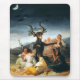 Goya Witches’ Sabbath mouse pad. Oil painting on canvas from 1798. Spanish painter Francisco Goya frequently drew on occult and mystical themes within his work. Witches’ Sabbath is one of Goya’s most famous paintings due to its dark subject matter and sense of the macabre. A coven of witches sits gathered around the figure of the devil portrayed as a goat with tremendously large horns adorned with a laurel of oak leaves. A child is being consecrated to the goat while multiple skeletons can be seen in the background. Overhead a hoard of bats flits above an inverted crescent moon.