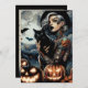Halloween party invitations. Grab your broom and fly over! Spooky gothic tattooed witch with a black cat, bats and full moon graphics.