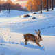 In this picturesque scene, a majestic hare dashes across a snow-laden field in the soft winter sunlight. This stylised watercolour image encapsulates the untamed beauty of nature, inviting you to embrace the serenity and vitality of the winter woods.