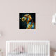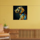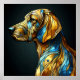 A portrait capturing a dog's head in a stylish pose against a dark backdrop. This abstract stained glass artwork features a palette of blue, turquoise, yellow, orange, and golden hues. The artistic texture and colours create a vibrant and elegant portrayal of our beloved four-legged friend.