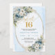 Celebrate a milestone moment with this elegant Sweet Sixteen invitation, featuring a refined watercolor design of dusty blue florals blended with soft white flowers and fresh eucalyptus greenery. Framed by a shimmering gold glitter border and paired with graceful script lettering, this invitation sets a sophisticated tone for a truly unforgettable Sweet Sixteen, Sweet 16th, or 16th birthday celebration.