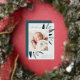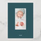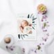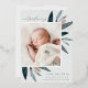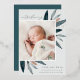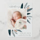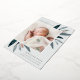 Elegant birth announcement features a single vertical/portrait orientated photo adorned with delicate blue-green watercolor leaves and rose gold foil accents. Personalise with your baby's name, birth date, stats, and a family signature. Add two additional square photos to the back.