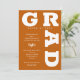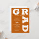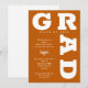 GRAD in bold white lettering curves around the edges of these burnt orange graduation party invitations. SEE THE ENTIRE COLLECTION of pre-done colours, paper plates, napkins, and more in our store.