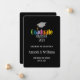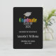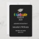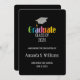 This is a simple and modern design with a grey graduation cap, yellow gold tassel, white text and black background. Colourful "Graduate” image. Yellow gold is printed colour, not metallic foil.