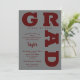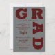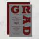 GRAD in bold dark maroon lettering curves around the edges of these grey graduation party invitations. SEE THE ENTIRE COLLECTION of pre-done colours, paper plates, napkins, and more in our store.