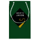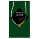 Graduation gift bag featuring creative black and gold cap design on a green background. Edit text to add senior class grad's name.