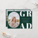 Rounded front photo frame, senior class graduation announcement/invitation. Dark green colour background, white bold type "GRAD" and text template lines for graduate's name, class of year and school. Back of card features two additional photo spaces and text lines for party information or other information about the graduate.