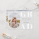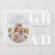 Rounded front photo frame, senior class graduation announcement/invitation. Light silver grey colour background, white bold type "GRAD" and grey text template lines for graduate's name, class of year and school. Back of card features two additional photo spaces and text lines for party information or other information about the graduate.