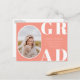 Rounded front photo frame, senior class graduation announcement/invitation. Solid peach pink colour background, white bold type "GRAD" and text template lines for graduate's name, class of year and school. Back of card features additional text lines for party information or other information about the graduate.