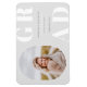 Rounded photo frame, senior class graduation announcement magnet. Soft silver grey background, white bold type "GRAD" and coordinating grey text template lines for graduate's name, class of year and school.