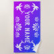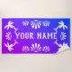 Pretty stencil palm trees and scallop sea shells in white on a blue to ultraviolet background. Personalised with your name in big, trendy hand written typography font. Great for that beach vacation.