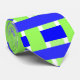 This tie has a geometric design of lines in shades of blue and green woven to make a plaid.