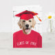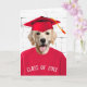 Golden retriever dog in a red t-shirt and graduation cap on brick wall background for graduate congratulations.