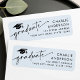 Light dusty blue return address labels featuring a graduation cap and the text "graduate" in a handwritten style font. To the right are template fields for your name and address.