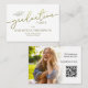 This design features a graduate student university school party invite insert card, with a graduation cap toppers template, a classic graduation cap mortarboard, great for high school college senior, with a QR code website online, a minimalist minimal modern gold, with photo senior picture, a graduation grad party details, a graduation party insert card, with website more information info