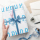 PhD graduation party wrapping paper that features the graduate’s name, field of study, and graduation date. This paper includes the name in a handwriting script font and a white and blue design. Simply add the graduate’s info, add this wrapping paper to your cart, and let the celebration begin!