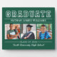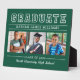 Classic 3 photo graduation plaque display sign with easel features Graduate in bold serif lettering with modern custom text that can be fully customised with the graduate's full name, class year, and school name. Add three favourite pictures of the graduate to the square placeholder images. Green background colour can be modified.